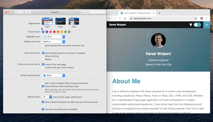Dark modes are more popular than ever, so I knew from the get-go I wanted to implement a color scheme switch on my website. To achieve this, a combination of media queries (to set an initial light or dark mode based on a user’s device) and CSS variables (to assign a theme's corresponding colors) are utilized. I’ve also included a toggle switch to freely change between light and dark modes, and incorporated fluid CSS transitions when swapping between schemes.